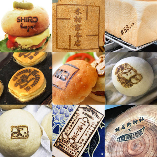 ステンレス製のオリジナル焼印ひとつでお菓子などの食品はもちろん、木材や革などいろいろな素材に焼印加工ができます。