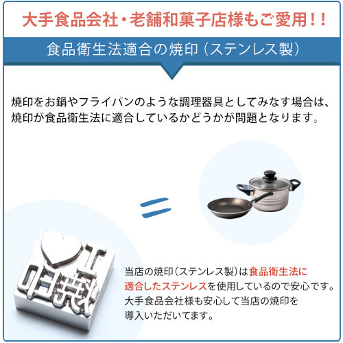 ステンレス製焼印の電気式セットは、安心の食品衛生法適合なので、大手食品会社様や老舗和菓子店様にも導入頂いております!