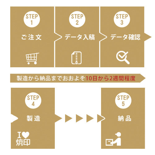 ご注文後にデータをご入稿いただき、確認後製作に取り掛かります。完成までにおおよそ10日~2週間程にて納品となります。
